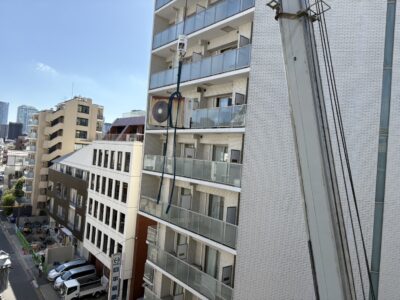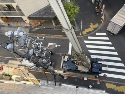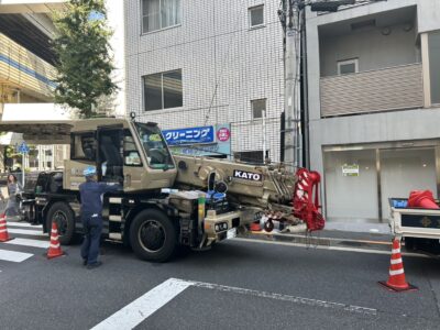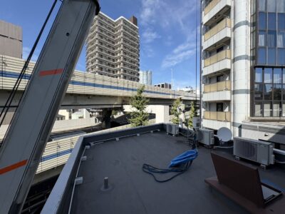 今回の物件では、オフィスビル屋上(6階部分)に室外機が設置されていたため、交換作業にはクレーン車(ラフター車)を使用しました。